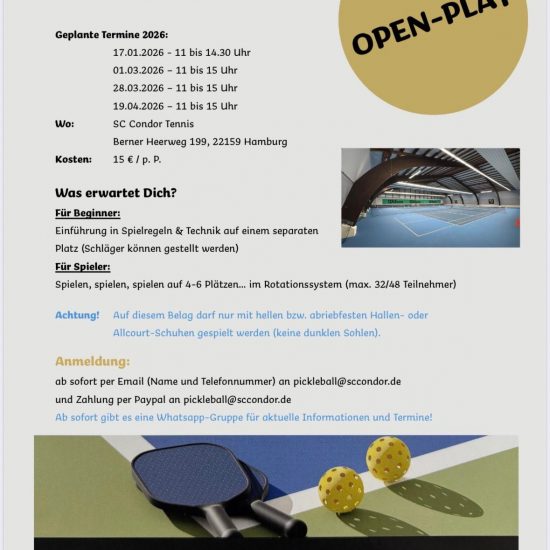 Pickleball ist eine der am schnellsten wachsenden Sportarten weltweit – eine Mischung aus Tennis, Badminton und Tischtennis, leicht zu erlernen und unglaublich spaßig. Am 17. Januar 2026 laden wir herzlich zu unserem Pickleball Open Play ein. Egal ob du Pickleball zum
