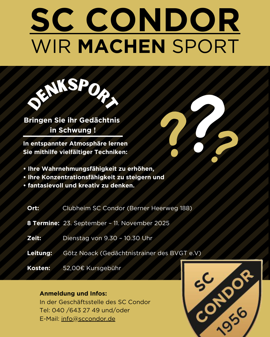 In entspannter Atmosphäre die Wahrnehmung schärfen, die Konzentrationsfähigkeit steigern sowie kreativ und fantasievoll denken – das ist Denksport beim SC Condor! Machen Sie mit und fördern Sie Ihre geistige Fitness. Vielleicht auch eine tolle Geschenkidee zu Weihnachten? 🎁✨